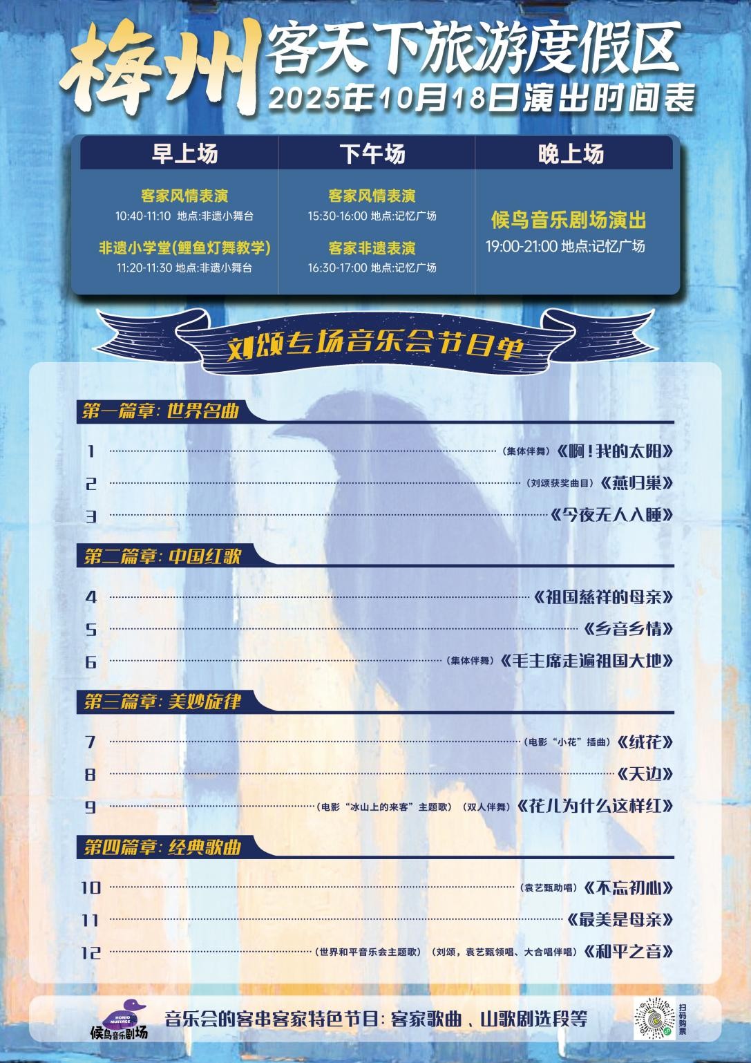 10月18日,广东梅州,客天下景区候鸟音乐剧场成功举办了“刘颂美声专场”,作为本系列四大专场中的第三场演出,本场活动由广东客天下旅游产业园有限公司主办,梅州客天下旅游度假区承办,并联合深圳市候鸟文旅创意产业集团有限公司与梅州市科卉农业发展有限公司共同协办,深圳索意文娱传媒有限公司担任执行单位。著名男高音歌唱家刘颂以宏阔的声线、细腻的情感,为观众呈现了一场融汇中西、贯通经典与时代的美声音乐盛宴,进一步拓展了“音乐+旅游+文化”融合模式的广度与深度。